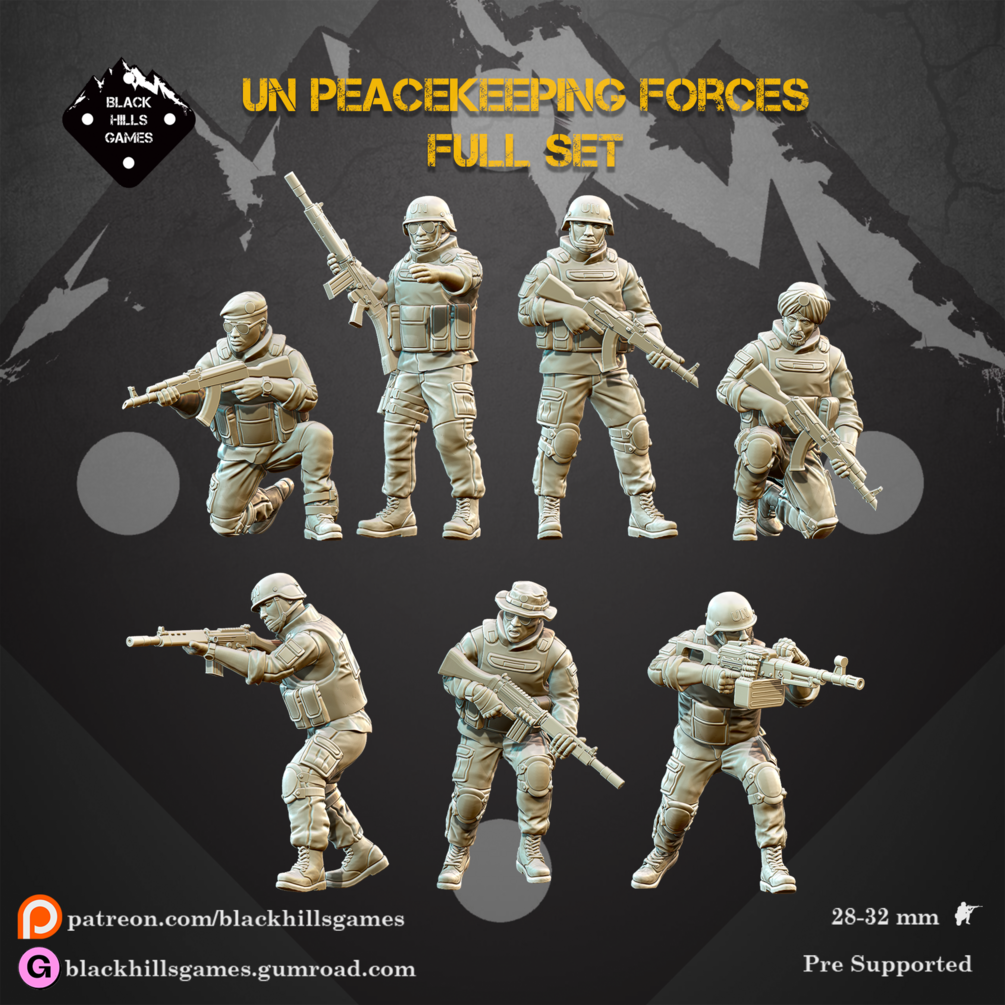 In this set you will find 5 models UN Peacekeeping Forces, carrying a of AK, FN FAL rifles and PKM.